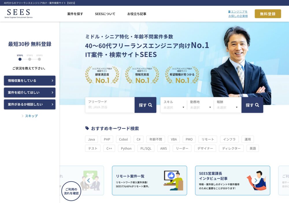 株式会社Miraieが運営する、経験豊富な40〜60代のITフリーランスエンジニアに向けた案件検索・紹介サイト「SEES」です。